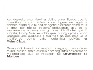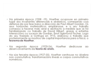 Por exemplo: ainvariancia con respecto á (dirección do eixo de) rotación dá a lei de conservación do momento angular. a invariancia de sistemas físicos con respecto á translación (dito simplemente, as leis da física non varían coa localización no espazo) dá a lei de conservación do momento lineal. a invariancia con respecto a (a translación en) o tempo dá a lei de conservación da enerxía.