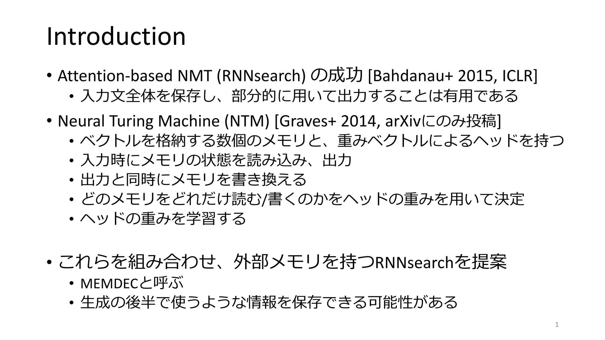 (RNNsearch) の成功 [Bahdanau+ 2015, ICLR] • 入力文全体を保存し、部分的に用いて出力することは有用である • Neural Turing Machine (NTM) [Graves+ 2014, arXivにのみ投稿] • ベクトルを格納する数個のメモリと、重みベクトルによるヘッドを持つ • 入力時にメモリの状態を読み込み、出力 • 出力と同時にメモリを書き換える • どのメモリをどれだけ読む/書くのかをヘッドの重みを用いて決定 • ヘッドの重みを学習する • これらを組み合わせ、外部メモリを持つRNNsearchを提案 • MEMDECと呼ぶ • 生成の後半で使うような情報を保存できる可能性がある 1