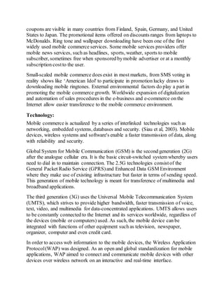 Mobile commerce refers to transactions initiated and completed using mobile devices. It allows consumers to purchase goods and services from sellers using their mobile phones. Key technologies that enable mobile commerce include wireless networks, GPS, and mobile payment systems. While still growing, mobile commerce provides consumers with ubiquity, as they can access information anywhere at any time from their mobile devices.