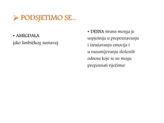 Dokument istražuje emocije, uključujući osnovne (radost, tuga, strah) i složene (ljubav, mržnja) te njihov utjecaj na tijelo i ponašanje. Emocije su povezane s aktivacijom različitih dijelova mozga i hormonalnim reakcijama, dok se raspoloženja razlikuju po intenzitetu i trajanju. Osim toga, spominje se upotreba poligrafa kao metode za mjerenje tjelesnih promjena koje prate emocije.