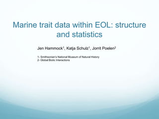 This document summarizes marine trait data available within the Encyclopedia of Life (EOL). It details that EOL contains over 500,000 trait records for around 290,000 marine taxa, inferred from 178 taxonomic nodes. Example datasets described include tissue mineralization records for 70,106 marine species, as well as data on distribution, habitat, and ecological associations. The structure of the trait data within EOL is also outlined.