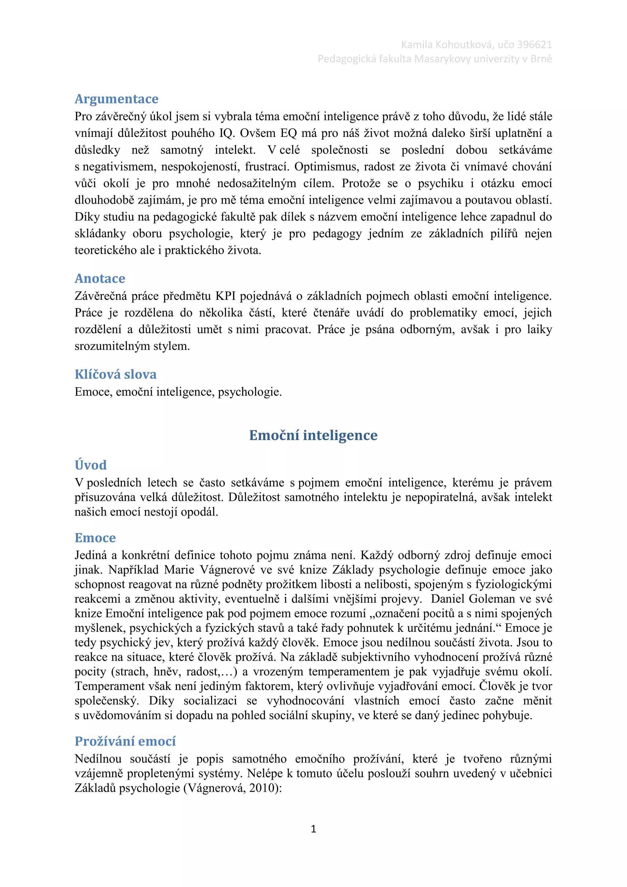 Závěrečná práce předmětu KPI pojednává o základních pojmech oblasti emoční inteligence.