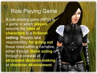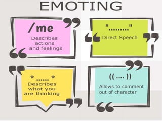 The document outlines the concept of role-playing games (RPGs) as immersive experiences where players adopt fictional characters and interact within a narrative. It emphasizes the importance of emoting in writing, where players express actions and emotions to enhance storytelling while practicing English language skills. Additionally, it provides examples and activities to engage students in role-playing, fostering creativity and critical thinking in language learning.