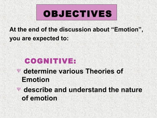The document discusses emotions and various theories of emotion. It defines emotion as a spontaneous reaction to pleasurable or unpleasurable stimuli, accompanied by physiological changes and readiness to act. Theories covered include the James-Lange theory that emotions arise from physiological arousal, and the Cannon-Bard theory that arousal is non-specific. The document also outlines characteristics of emotions, basic emotion types, steps for managing emotions, and defines emotional intelligence.