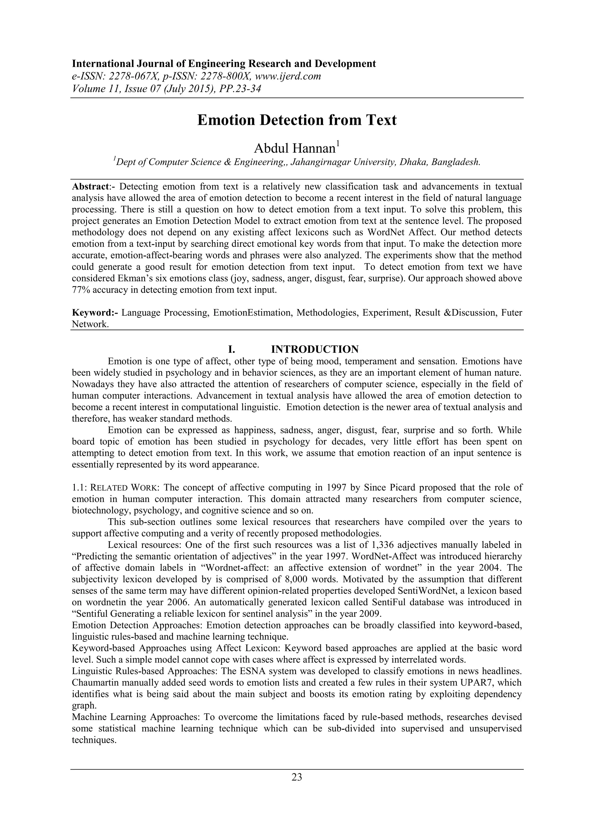 This document discusses emotion detection from text. It presents an emotion detection model that extracts emotion from text at the sentence level without relying on existing affect lexicons. The model detects emotion by searching for direct emotional keywords and emotion-affect words/phrases. Experiments show the method achieves over 77% accuracy in detecting Ekman's six basic emotions from text. The document also reviews related work on emotion detection approaches, including keyword-based, rule-based, and machine learning methods. It discusses challenges like the lack of large annotated training data and limitations of dictionary-based approaches.
