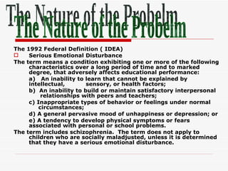 The document discusses children with emotional and behavioral disorders. It notes that there are many potential causes of such disorders and labels used to describe them. It also outlines characteristics that may be exhibited, such as attention problems, aggressive behavior, withdrawn behavior, and hyperactivity. The document emphasizes the importance of specifying teaching objectives based on individual student abilities and selecting strategies and materials to meet those objectives while managing disruptive behaviors.