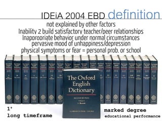 The document discusses emotional and behavioral disorders (EBD) in children as defined by IDEA 2004. It notes that EBD is identified by marked difficulties in educational performance over an extended period of time due to internalizing or externalizing behaviors. Around 2% of school-aged children have EBD, with males and older students more likely to be identified. Risk factors include poverty, learning disabilities, and unstable home environments. Effective identification and support of students with EBD requires multimodal assessment and the use of positive behavioral interventions and engaging instructional approaches.