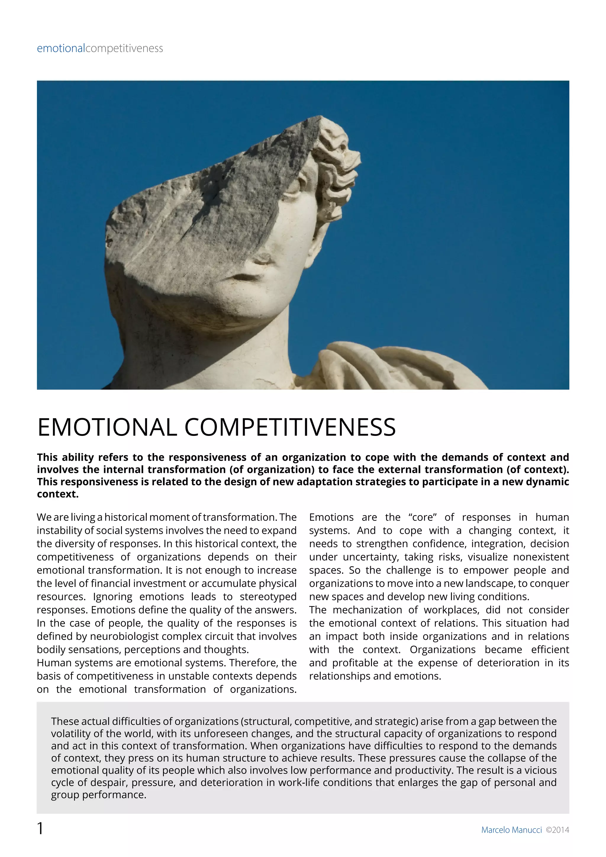 Emotional competitiveness refers to an organization's ability to adapt and respond to evolving external conditions through emotional transformation. This adaptability is essential for maintaining relationships and performance in unstable contexts, as emotional responses significantly influence organizational dynamics and individual behaviors. A focus on emotional quality is crucial to avoid a decline in productivity and well-being, necessitating a shift in how organizations manage human resources and relationships.