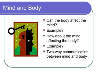 The document discusses the relationship between emotional states, stress, and physical health. It finds that negative emotional states like stress are associated with weaker immune function and poorer health, while positive states like happiness boost immune response. Emotions influence health through effects on things like coping strategies, social support systems, and immune cells. The mind and body closely interact, with each able to influence the other. Maintaining optimism, laughter, and strong social connections can support wellness.