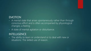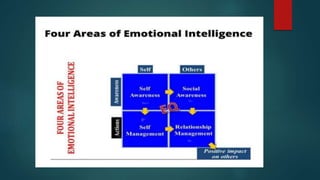 Emotional intelligence refers to the ability to recognize and manage emotions in ourselves and in our relationships. There are three main models of emotional intelligence: ability, mixed, and trait. The ability model focuses on accurately perceiving, using, understanding, and managing emotions. The mixed model developed by Daniel Goleman emphasizes emotional and social competencies important for leadership. Research has found emotional intelligence correlates with important work outcomes like job performance, decision-making, creativity, and leadership effectiveness. Assessing and developing emotional intelligence can benefit organizations in areas such as selection, motivation, negotiation, and customer service.