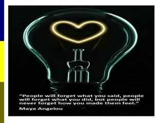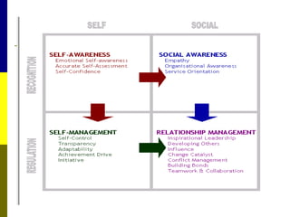 The document discusses the significance of emotional intelligence (EQ) in nursing, distinguishing it from cognitive intelligence (IQ) and highlighting its role in effective patient care and workplace relationships. It outlines how high EQ contributes to lower stress levels, improved decision-making, and greater job satisfaction, while addressing the importance of training in emotional competencies for better healthcare outcomes. Additionally, the document emphasizes that EQ is a crucial quality for nurse leaders to foster a supportive work environment and enhance overall team performance.