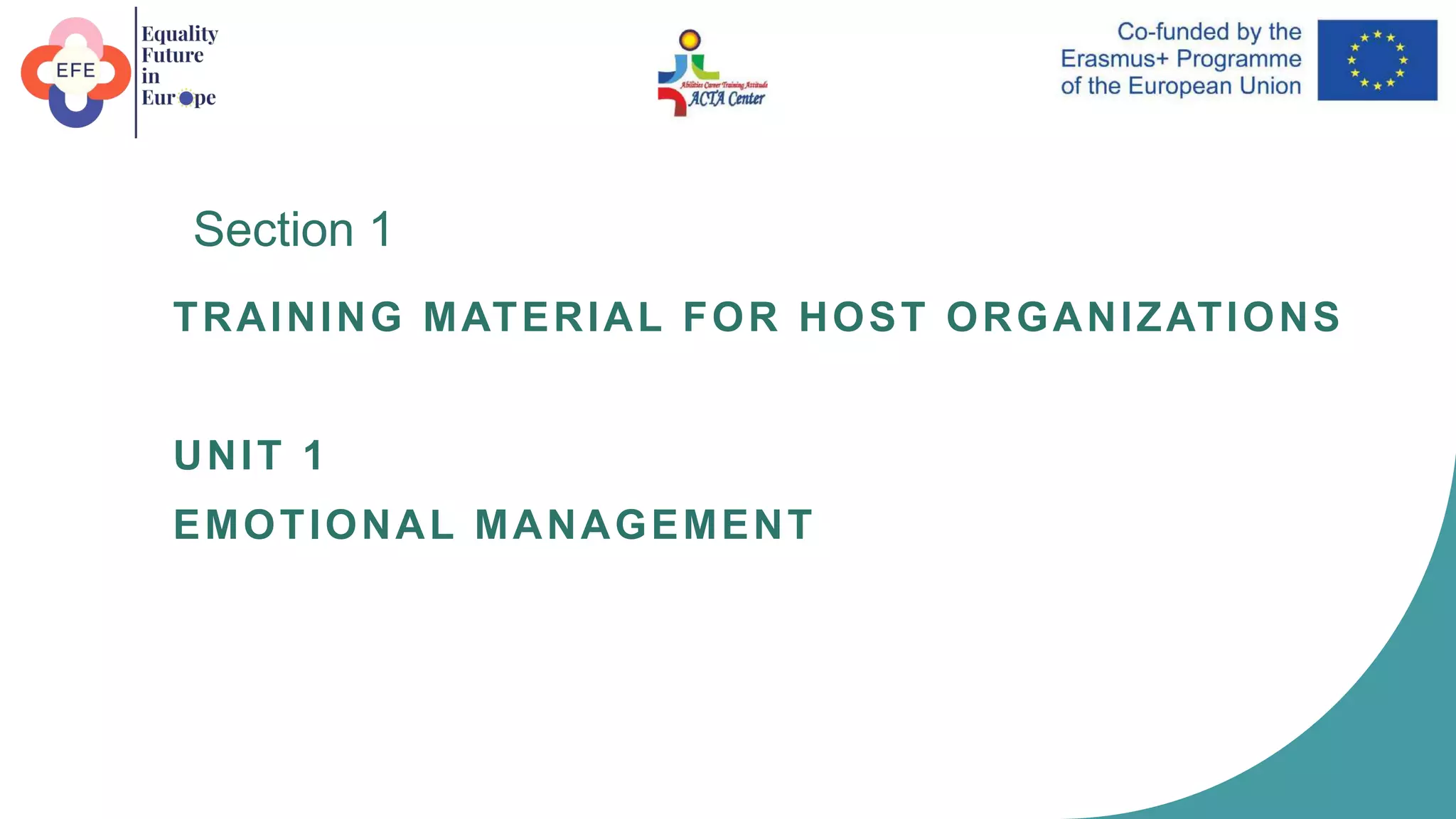 This document provides training material on emotional management. It discusses emotional intelligence and its components, empathy, non-violent communication, anger management, and fostering a positive work environment. The goals are to better understand emotions, improve communication skills to resolve conflicts, and apply anger management techniques. Key concepts covered include emotional intelligence, empathy, communication styles, causes of anger, and factors for an effective organization. Videos and activities are included to demonstrate these concepts.