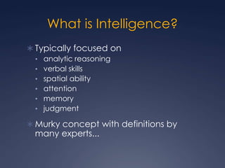 Emotional intelligence refers to the ability to recognize and manage emotions in ourselves and in our relationships. It is a stronger predictor of career and life success than IQ. Emotional intelligence has 5 components: self-awareness, self-regulation, motivation, empathy, and social skills. Developing emotional intelligence can improve health, relationships, and performance at work and in leadership roles. As collaboration increases, emotional intelligence will become even more important in the future.