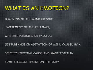This document discusses emotional intelligence and its importance. It defines emotions and types of emotions. Emotional intelligence involves managing one's own emotions as well as understanding others' emotions through empathy. High emotional intelligence is especially important for leaders as they must motivate employees and deal with challenges. The document outlines five components of emotional intelligence: self-awareness, managing feelings, self-motivation, empathy, and relationship management. Low emotional intelligence can lead to relationship problems, poor decisions, lack of career advancement, and other issues. Developing emotional intelligence is important for success in the workplace.