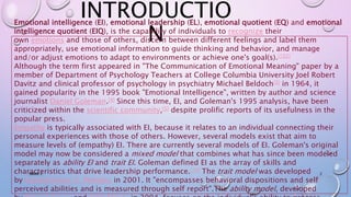 This document discusses emotional intelligence, including its definition, history, models, and criticisms. It provides definitions of emotional intelligence as the ability to recognize and manage one's own emotions and the emotions of others. The document traces the history of the concept originating in 1964 and gaining popularity from Daniel Goleman's 1995 book. It describes three main models of emotional intelligence: the ability model focusing on perceiving, using, understanding, and managing emotions; the mixed model introduced by Goleman combining abilities and traits; and the trait model measuring self-perceived abilities. The document also notes criticisms of emotional intelligence regarding whether it is a true intelligence and its validity compared to IQ and personality traits.