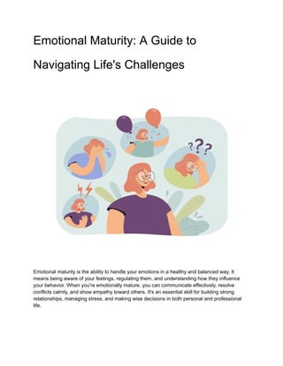 Emotional maturity is the ability to recognize and manage one's emotions effectively, allowing for improved communication, conflict resolution, and empathy. It is crucial for building strong relationships, managing stress, and making sound decisions. Developing emotional maturity involves self-reflection, acceptance of feelings, mindfulness, and other techniques to foster personal growth and well-being.