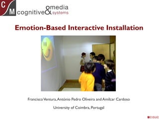 This document describes an emotion-based interactive installation that uses an Emotion-Driven Music Engine (EDME) to perceive emotions from participants and express emotions through music and images. The installation uses a camera to recognize the number of participants and their movement, which determines the emotional state of the system. EDME then generates appropriate music and selects relevant images based on the system's emotional state. Experiments found that participants successfully experienced and influenced the system's emotions through their actions.