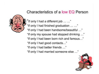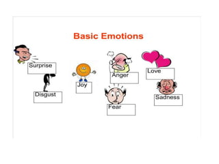 The document discusses emotions and emotional intelligence. It defines emotions as internal conscious states that involve feelings, bodily arousal, purposive motivation, and social expression. Emotions can be positive or negative, and are influenced by factors like personality, culture, stress, age, and environment. The document also discusses emotional labor, where workers must display certain emotions as part of their job. Additionally, it defines emotional intelligence as the ability to identify, assess, and manage one's own emotions and the emotions of others. Emotional intelligence involves self-awareness, self-management, social awareness, and relationship management. The document argues that emotional intelligence can lead to advantages like greater productivity and better conflict resolution.