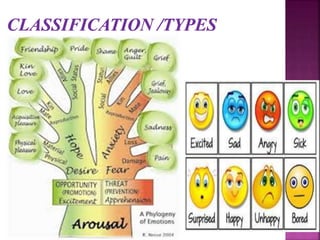 Emotions are complex states that involve physiological, cognitive, and behavioral components. They arise from our interpretation of situations based on physiological arousal and environmental cues. The three main theories on emotions are the James-Lange theory, which claims physiological arousal precedes emotions, the Cannon-Bard theory, which says physiological arousal and emotional experience occur simultaneously, and the Schachter-Singer theory, which posits that physiological arousal and cognitive labeling of the situation together produce distinct emotions. Emotions are expressed through facial expressions, vocal tones, and body language and involve physiological changes in the body. People can learn to control emotions using biofeedback, drugs, desensitization, flooding, self-statements, and coping strategies.