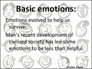 The document discusses basic human emotions. It identifies eight primary emotions according to psychologist Plutchik: trust, fear, surprise, sadness, disgust, anger, anticipation, and joy. It describes how each emotion affects behavior and provides examples of opposite, mixed, and varying intensities of emotions. It also distinguishes between positive and negative emotions and explains how emotions and moods are related and can impact judgment.
