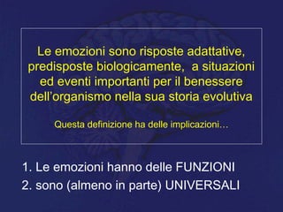 Il documento esplora la natura delle emozioni, definendole come risposte biologiche adattative a eventi significativi, e descrive le loro componenti fisiologiche e cognitive. Viene sottolineata l'universalità delle emozioni e la loro funzione comunicativa, sia interna che esterna, nonché l'importanza della loro espressione nel regolare le interazioni sociali. Vengono inoltre analizzate specifiche emozioni come paura, rabbia, gioia e ansia, evidenziando le loro caratteristiche, funzioni e impatti sul comportamento umano.