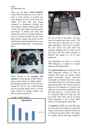 This document provides an analysis of the EMP magazine, which targets alternative audiences aged 16-30. It summarizes that the magazine primarily features young models aged 20-30 wearing alternative clothing, accessories, and merchandise from bands. While it includes some content for females, the magazine seems to be more aimed at males, which is unusual compared to most clothing magazines. The typical content found in each issue includes clothing and accessories for both males and females, band interviews, and older and newer music albums and posters. Overall, this information suggests that EMP magazine appeals particularly to younger alternative audiences of both genders through its niche focus on dark and unique clothing styles inspired by music subcultures.