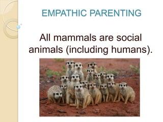 This document discusses the importance of empathy and listening skills for parents. It begins by explaining how mammals have evolved to rely on empathy and communication to meet basic needs. Empathy is defined as understanding another's feelings rather than just feeling sympathy. The rest of the document provides tips for empathetic listening with examples of how children and dogs signal discomfort through body language and behaviors before escalating to more aggressive actions if not listened to. Empathic listening is presented as a way for parents to understand their children's perspectives and avoid behavioral issues.