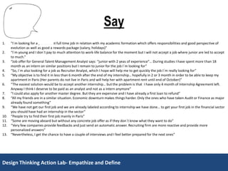 This document describes the situation of a 25-year-old French woman, M., who is looking for her first job after completing a business administration degree and internship. She is worried about finding a job within 6 months as her parents can only support her apartment in Paris until October. While she has relevant experience, she feels companies often seek more experience than someone junior could realistically have. The document outlines her thoughts, feelings and insights into her job search experience and challenges facing recent graduates in a difficult economic environment.