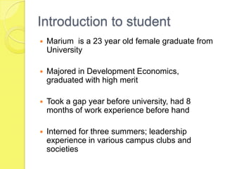 Marium is a 23-year-old woman who recently graduated with a degree in Development Economics. She interned extensively and was excited to begin her career in international development. However, she found that her new job involved constant supervision, more bureaucracy than expected, and an emphasis on conformity rather than independence. While she enjoys the work and her colleagues, Marium feels her idealism is frustrated by the realities of her development organization. She wants to make an impact while also working in an enjoyable environment that trusts her abilities.