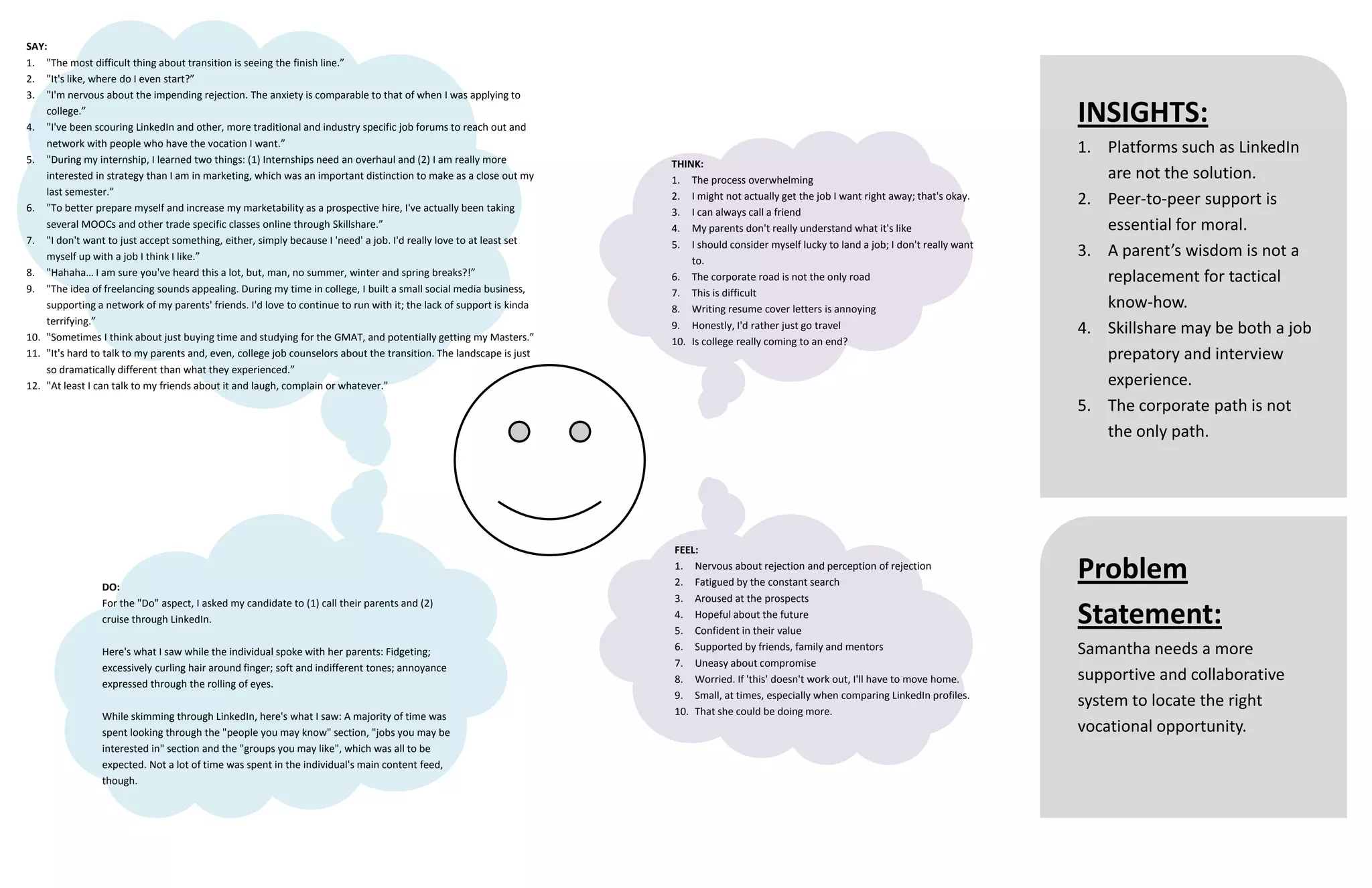 Samantha is struggling with the transition from college to her career and feels overwhelmed by the process. She is nervous about potential rejection from employers and relies on her friends for support since her parents don't fully understand her situation. Samantha is considering various options like freelancing, getting a master's degree, or traveling for a while to take pressure off her job search. She would benefit from a more personalized career guidance system to help navigate options and feel less anxious about an uncertain future.