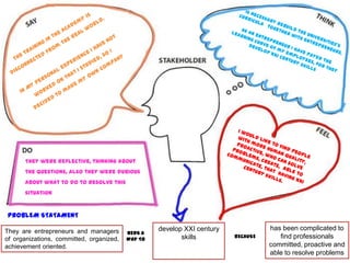 This document discusses developing 21st century skills in professionals. It notes that while professionals are often committed and achievement-oriented entrepreneurs and managers, it has been complicated to find those who are also committed, proactive, and able to resolve problems. The document proposes using an empathy map to help develop these key skills in professionals.