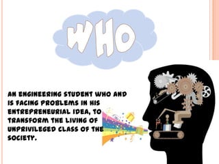 The document discusses the challenges faced by an engineering student who wants to help the underprivileged in society through technical solutions but lacks guidance and funding. He developed plans to help rural communities but his requests for support were ignored. While happy to think of inexpensive machines for the poor, he is frustrated with a system that favors the rich and creates hurdles for the underprivileged. This problem is faced not just by him but by all students who want to use their skills and education to help society rather than prioritizing money and power.