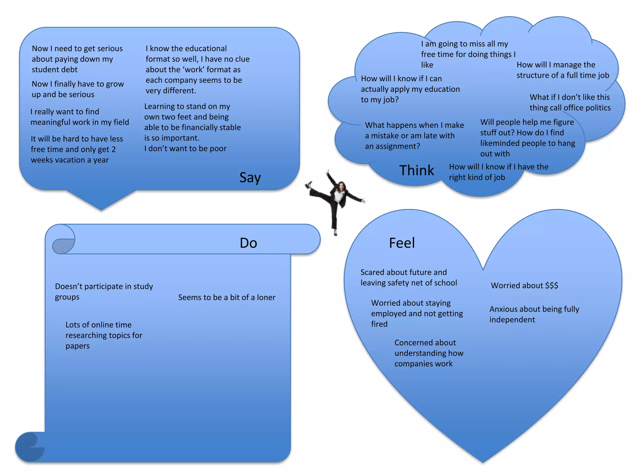 The document outlines the concerns of a recent graduate entering the workforce. She is worried about paying off student debt, applying her education to a job, financial stability, employment security, understanding company operations, work-life balance, making mistakes at work, and finding a supportive social network. As a risk-averse and perfectionistic person, she struggles with the transition from the educational structure to the uncertainties of working life and independence. Developing a transition plan could help alleviate her anxieties over this major life change.
