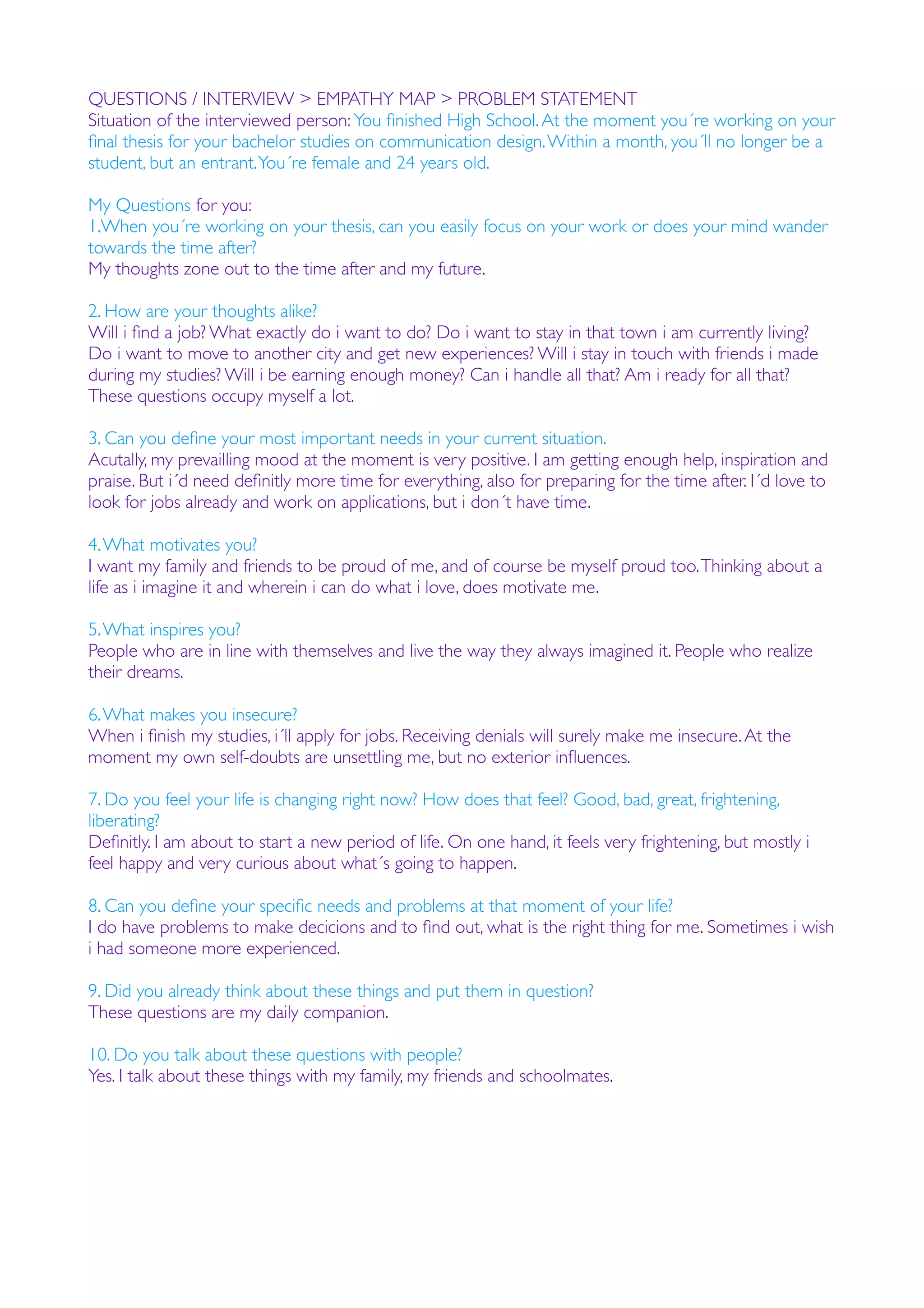 The document summarizes an interview with a 24-year-old female student completing her bachelor's thesis and facing an uncertain future. She is worried about finding a job, whether to stay in her current city or move, maintaining friendships, and her ability to support herself financially. While motivated by pride and pursuing her dreams, she feels insecure about potential job rejections. She struggles with decisions and wishes for more experienced guidance. The problem is identified as her feelings of restraint and self-doubt due to uncertainty about her path and too many perceived opportunities.