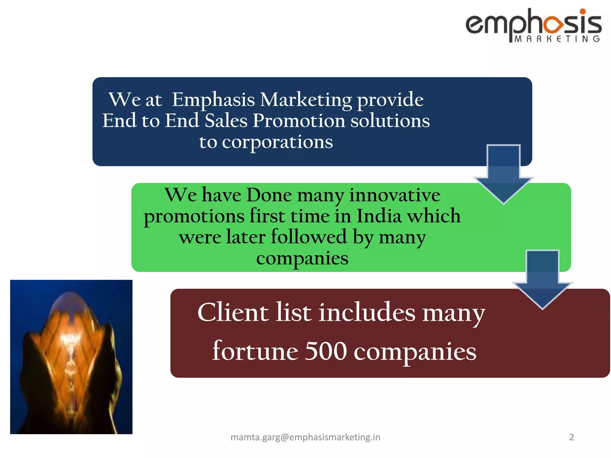 Emphasis Marketing specializes in end-to-end sales promotion solutions for corporations, having worked with various Fortune 500 companies. Their offerings include innovative promotions like online, SMS-based promotions, and customer loyalty programs, designed to motivate consumers to make purchases. Recent promotional campaigns include collaborations with Bharti Airtel, The Mobile Store, Goodyear, and Tata Sky, showcasing a variety of engaging formats such as assured gifts and scratch card incentives.