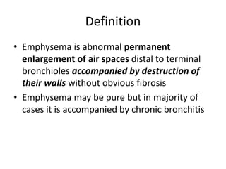 Emphysema is a lung disease characterized by abnormal enlargement of the air spaces in the lungs. There are several types of emphysema including centriacinar, panacinar, distal acinar, and irregular emphysema. The main pathogenesis involves an imbalance between protease enzymes like elastase released by smoke exposure and antioxidant proteins like alpha-1 antitrypsin that normally inhibit these enzymes. This imbalance leads to destruction of lung elastic tissue and enlargement of the air spaces. Patients may present as "pink puffers" with barrel chests and prolonged expiration or "blue bloaters" with hypoxia and cor pulmonale. Diagnosis involves spirometry showing reduced FEV1 and imaging