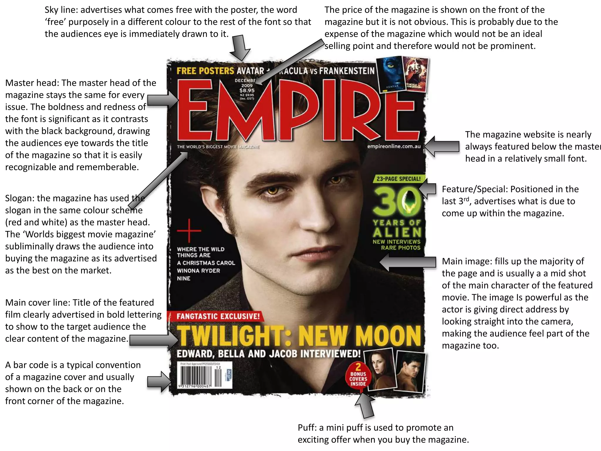 The document describes the typical layout and design elements of a movie magazine cover. It notes that the magazine website is featured below the main title in small font. The main image takes up most of the cover and is usually a mid-shot of the main character from the featured movie, looking directly at the camera. Additional elements include the skyline advertising free gifts, the consistent bold and red main title, the film title in bold letters, the non-prominent price, a barcode, mini advertisements, the slogan in red and white matching the title, and notices of features and specials in the last third of the cover.