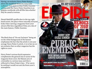 The document discusses the cover of a magazine featuring Harry Potter and the film Public Enemies. It analyzes various elements of the cover including the prominent placement of Harry Potter above the masthead to draw in audiences, Daniel Radcliffe's profile picture in the top right corner, and the text "On-set Exclusive" emphasizing an exclusive article. It also examines the serious facial expression of Harry Potter complementing the atmosphere of criminality, and the prominent Tommy gun pointing towards but not directly at the viewer to convey danger without being overly violent.