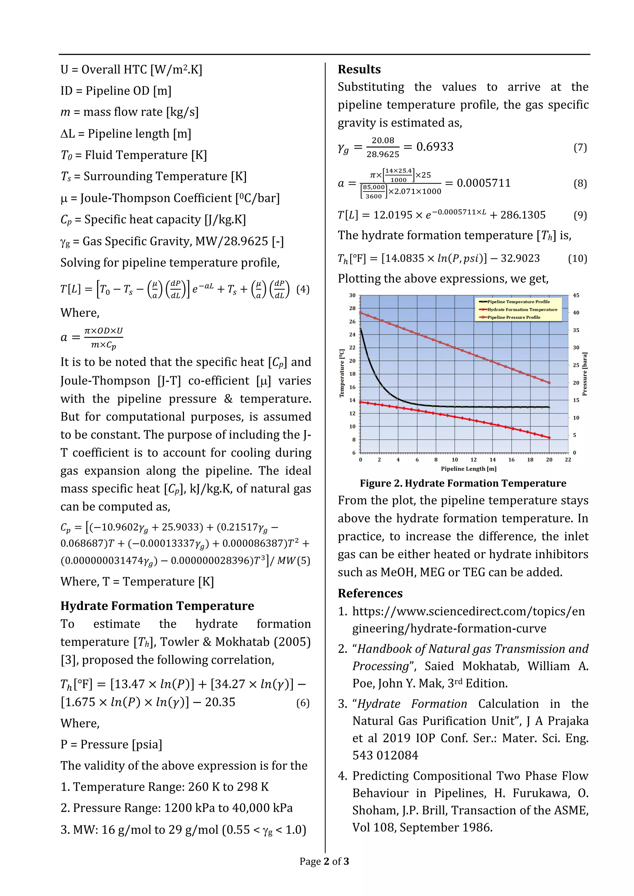 This document describes a methodology for estimating natural gas hydrate formation in pipelines. It presents an empirical approach using equations to model the pipeline temperature profile based on factors like operating pressure, temperature, heat transfer rate, and Joule-Thomson cooling effect. The methodology is applied to a case study of a 20km pipeline carrying natural gas. The results show the pipeline exit temperature remains above the hydrate formation temperature calculated along the pipeline length using established correlations, avoiding hydrate plug formation. In practice, heating the inlet gas or adding hydrate inhibitors can further increase this difference to improve safety.