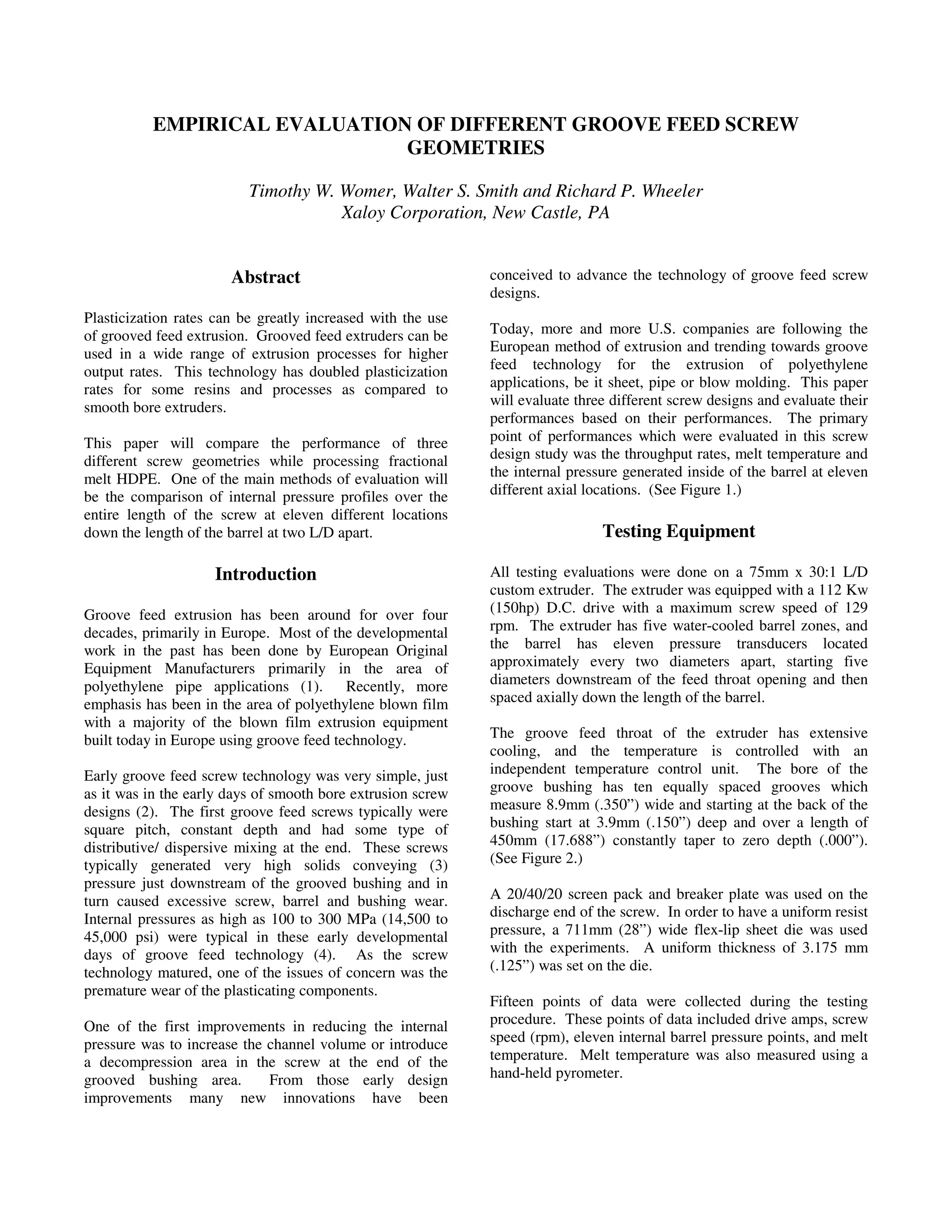 The document evaluates different groove feed screw geometries to enhance plasticization rates in extrusion processes, specifically for processing fractional melt HDPE. Three distinct screw designs were tested, with findings indicating that screw 'c' exhibited the highest throughput rate and lowest melt temperature, thereby demonstrating superior performance. The study highlights the significant impact of screw geometry on internal pressure, output, and melt temperature in groove feed extrusion technology.
