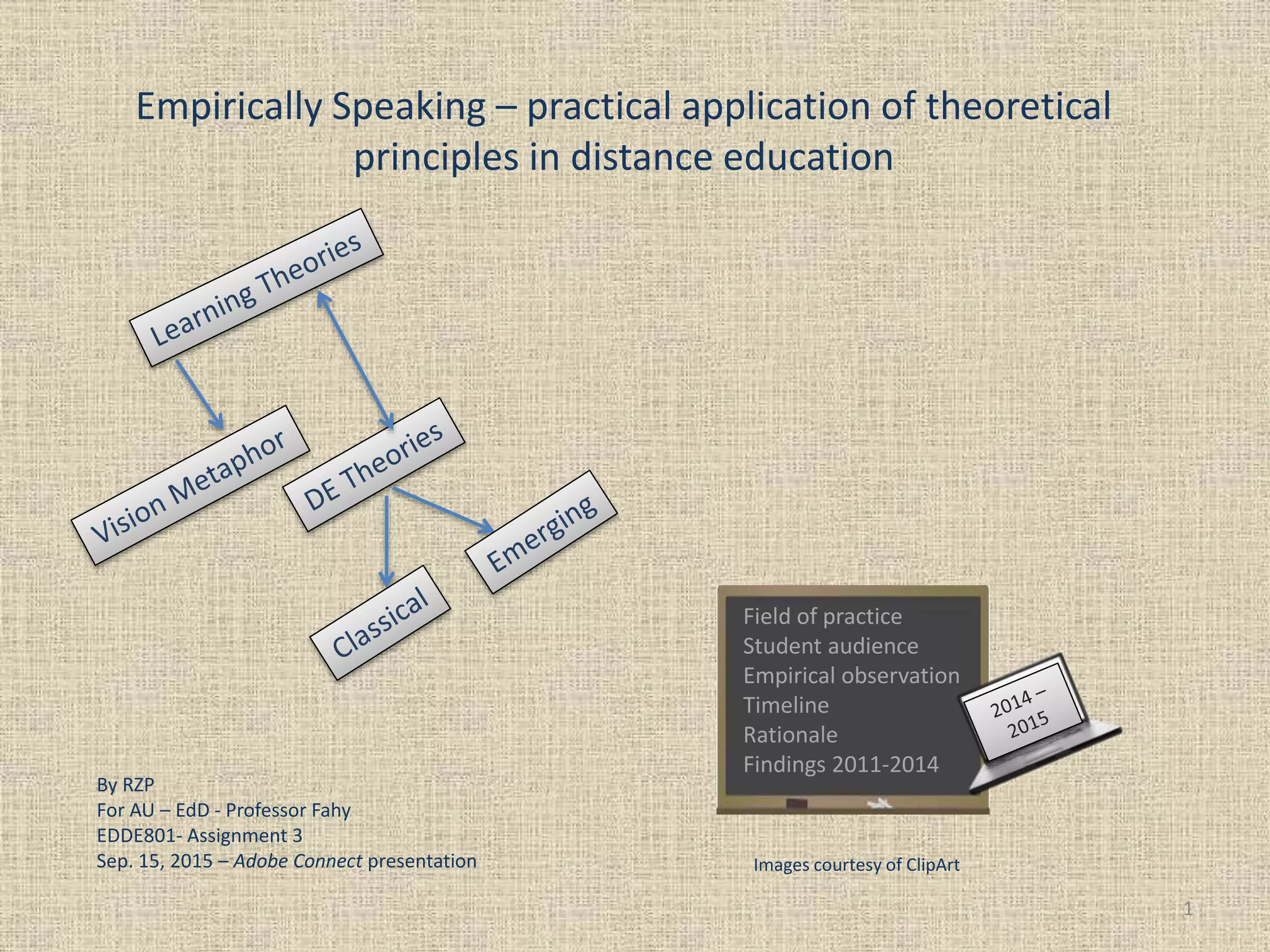 The document presents an exploration of the application of theoretical principles in distance education, discussing various learning theories and their relevance. It emphasizes the importance of incorporating empirical observations and integrating multiple teaching strategies to cater to diverse learner needs. Additionally, it critiques established metaphors of learning and advocates for a more dynamic understanding of knowledge construction.