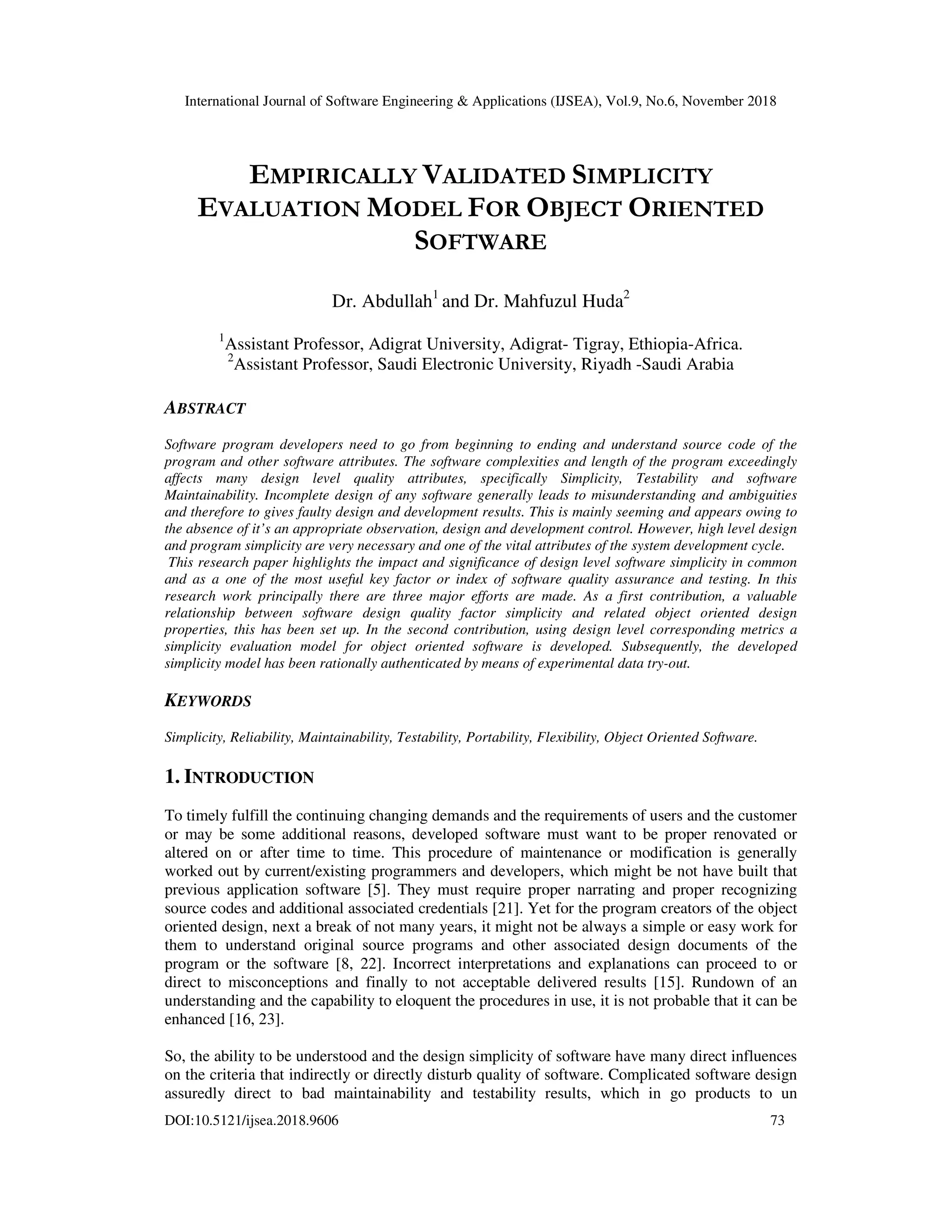 Software program developers need to go from beginning to ending and understand source code of the program and other software attributes. The software complexities and length of the program exceedingly affects many design level quality attributes, specifically Simplicity, Testability and software Maintainability. Incomplete design of any software generally leads to misunderstanding and ambiguities and therefore to gives faulty design and development results. This is mainly seeming and appears owing to the absence of it’s an appropriate observation, design and development control. However, high level design and program simplicity are very necessary and one of the vital attributes of the system development cycle. This research paper highlights the impact and significance of design level software simplicity in common and as a one of the most useful key factor or index of software quality assurance and testing. In this research work principally there are three major efforts are made. As a first contribution, a valuable relationship between software design quality factor simplicity and related object oriented design properties, this has been set up. In the second contribution, using design level corresponding metrics a simplicity evaluation model for object oriented software is developed. Subsequently, the developed simplicity model has been rationally authenticated by means of experimental data try-out.