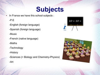 The document outlines the daily timetable and subjects at a French school. The morning session runs from 8:05 am to midday with a 15 minute break at 10:00 am. The afternoon session is from 2:00 pm to 5:00 pm with a 15 minute break at 4:00 pm. While school is in session seven hours a day, Wednesday afternoons are not. Core subjects include PE, English, Spanish, music, French, maths, technology, history, sciences, and art. Optional subjects offered include Latin, additional English, choir, student assistance, and additional sports through UNSS.