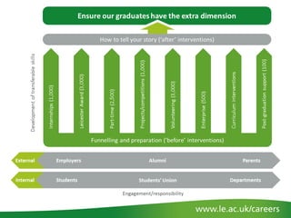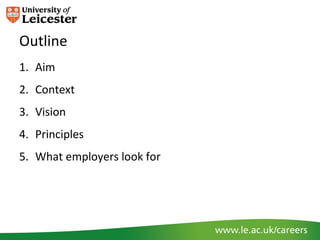 The document discusses employability at the University of Leicester. It outlines the university's aim to ensure graduates have experiences that make them attractive to employers. It discusses challenges in the current labor market and what employers seek - including degrees, experience, skills, and personal brands. The university's vision is supported by principles of engaging stakeholders, offering opportunities like employability modules and extracurricular activities, and enhanced support before, during and after university.