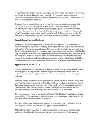 Employee appraisals are designed to review an employee's performance over a set period of time, usually annually, and identify areas for improvement or development. The process aims to provide employees with a safe environment to give feedback and discuss their work in a constructive manner. Objectives set during appraisals should be Specific, Measurable, Achievable, Realistic, and Time-bound to promote employee development. While appraisals can impact salary, training, and career prospects, they must be handled sensitively to avoid demotivating employees and improve company loyalty.