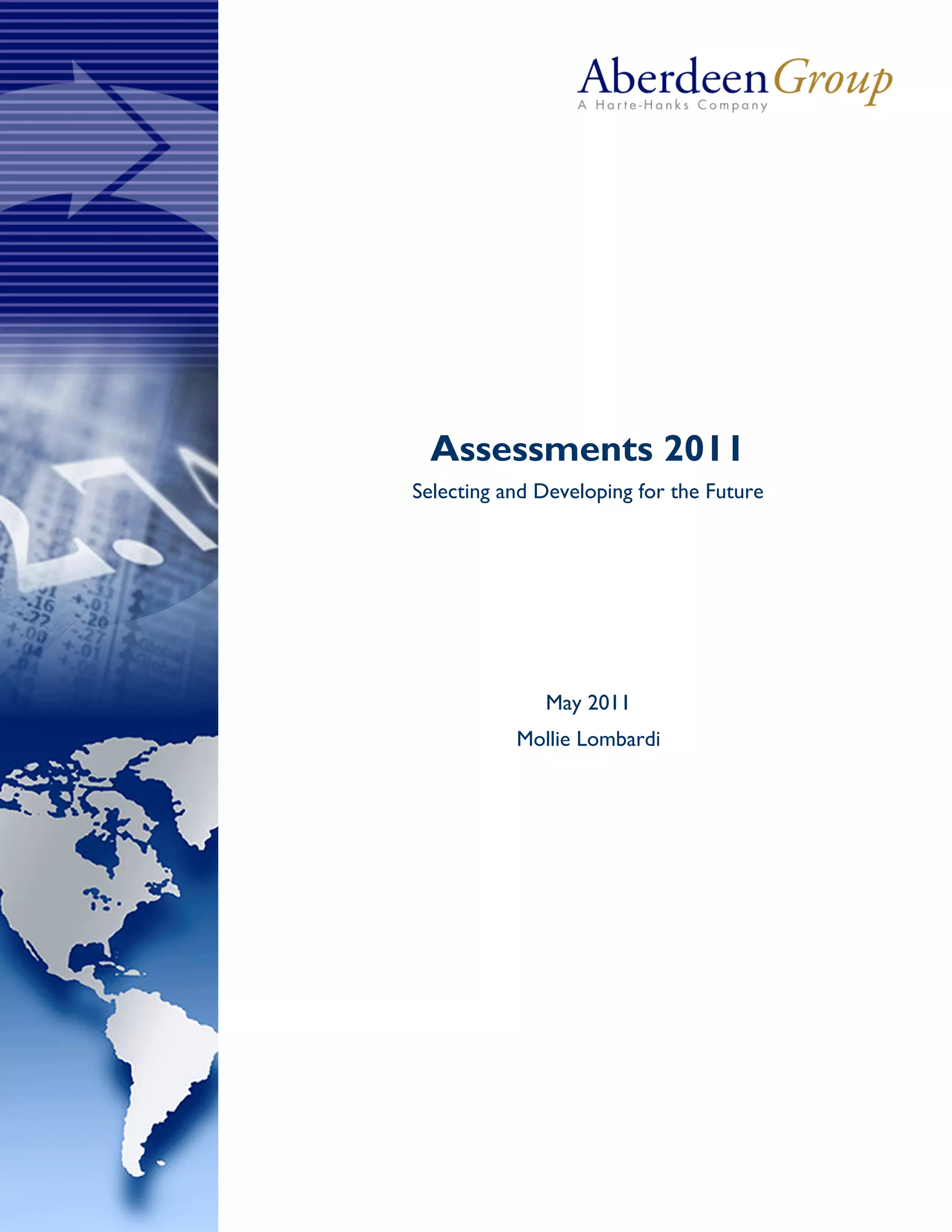 This document summarizes the key findings of a benchmark study from Aberdeen Group that analyzed over 640 organizations regarding their use of talent assessments. The study identified best practices of organizations ("Best-in-Class") that achieved high performance in areas like employee performance and succession planning. Best-in-Class organizations were found to use assessments at multiple points in the employee lifecycle from hiring to succession. They collaborated between HR and business leaders to define competencies for assessments and used various assessment types appropriate for different decisions. Adopting these assessment strategies was correlated with improved metrics like employee performance and hiring manager satisfaction.