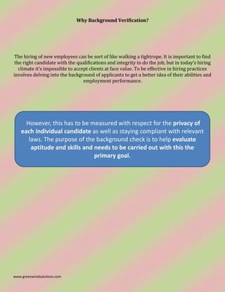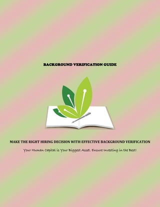 The document outlines the importance of background verification in the hiring process, emphasizing the need to balance candidate assessment with privacy and legal compliance. It details the required documents for candidates, verification criteria, and procedures for assessing qualifications and character. Additionally, it addresses potential outcomes of the verification process, including notifications for successful and unsuccessful candidates.