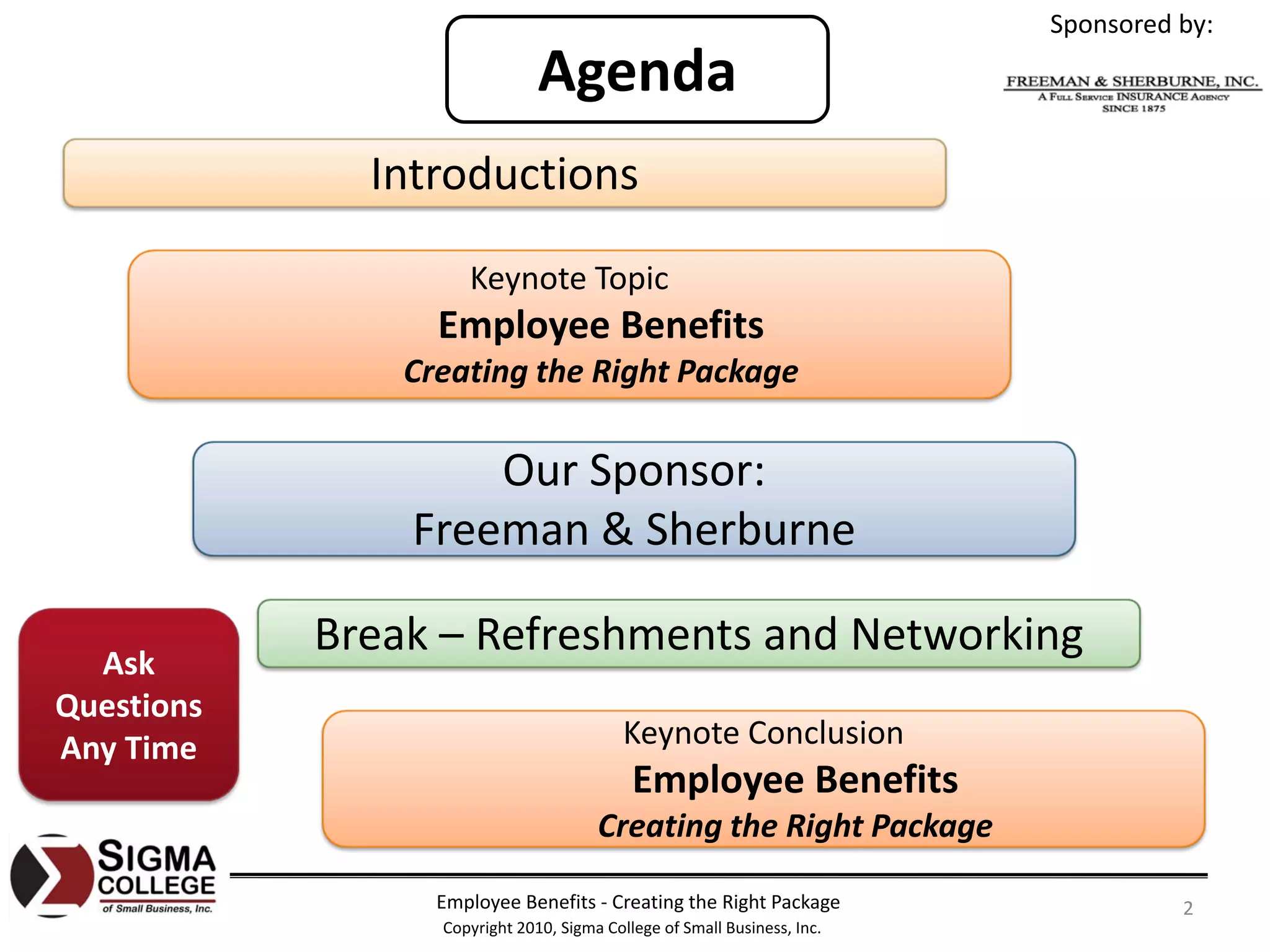 Sponsored by: Agenda Introductions Keynote Topic Employee Benefits Creating the Right Package Our Sponsor: Freeman & Sherburne Break – Refreshments and Networking Ask  Questions  Any Time Keynote Conclusion Employee Benefits Creating the Right Package Employee Benefits ‐ Creating the Right Package 2 Copyright 2010, Sigma College of Small Business, Inc.