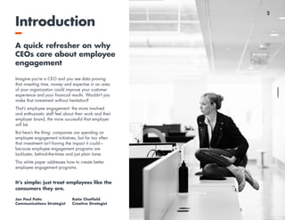 The document discusses the importance of employee engagement for organizational success and how it correlates with customer experience and financial performance. It emphasizes the need for companies to modernize their employee engagement programs by treating employees as consumers, utilizing effective communication strategies, and understanding diverse engagement drivers. Ultimately, fostering a strong internal brand and nurturing a culture of respect and relevance can enhance both employee and customer satisfaction.