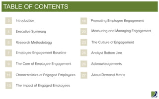 The document is a benchmark report on employee engagement that was sponsored by Demand Metric Research Corporation. It contains research on measuring and promoting employee engagement. The report found that companies with over 50% of employees engaged have higher productivity, morale, customer loyalty and profits. Engagement is driven by company culture and leadership commitment. Measuring engagement helps manage it and the most direct way is through employee surveys. High engagement levels create a culture that benefits both employees and customers.